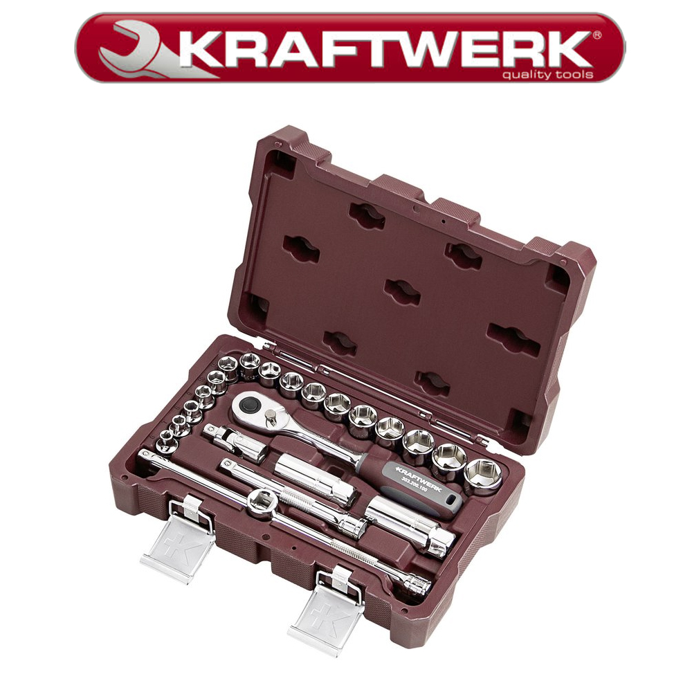 Den nye skraldekasse indeholder en Pro Line vendbar skralde med 3/8 firkantet træk med hurtig udkast og omskiftergreb, fatninger med en skruenøglestørrelse fra 6 til 22 mm, overskueligt arrangeret og klar til hånden. Vi supplerede sættet med en forlænger, adapter og en kardansamling. Derudover medfølger 2 tændrørsfatninger med 16 og 22 mm.