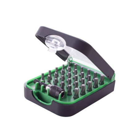 Indeholder: • Bitsholder med magnetisk selvspændende patron • Bits Torx: T10 (x2)/T15 (x3)/T20 (x10)/T25 (x10)/T30 (x5)