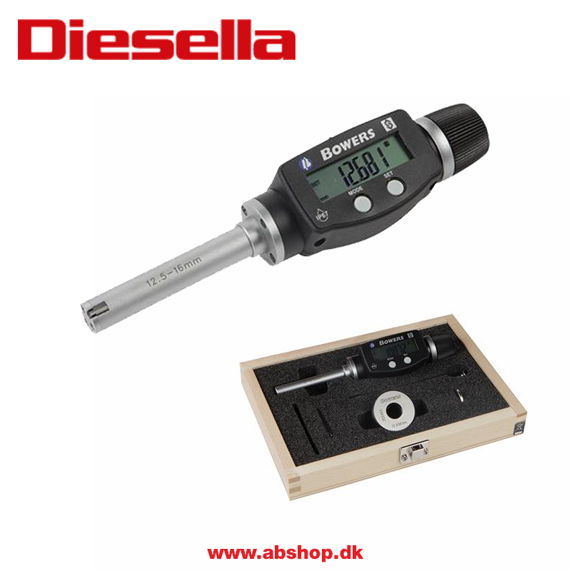 Bowers digitale 3-punkts mikrometer måleområde 10-12,5 mm. Stor og klar LCD-skærm – IP67 beskyttelsesklasse. Inkl. 12,5 mm kontrolring og certifikater.