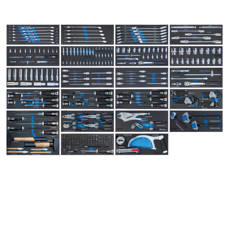 Værktøjsvognen har 8 praktiske skuffer, hvor værktøjerne er systematisk organiseret, så du hurtigt kan finde det rette værktøj. De 350 værktøjer omfatter et bredt udvalg af håndværktøj, som gør vognen velegnet til montage, reparation, service og vedligeholdelse. Den strukturerede opdeling giver et godt overblik og reducerer spildtid under arbejdet.
