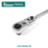 Ekstra lang skralde med led og lille skraldehoved til arbejde på begrænset plads. Indfældet hurtiglåseknap til toppen. Med ekstra tætte trin og 72 tænder. Reversibel med håndtag og ergonomisk udformet greb med friktionsflader. Tåler momentkræfter op til 700 Nm.