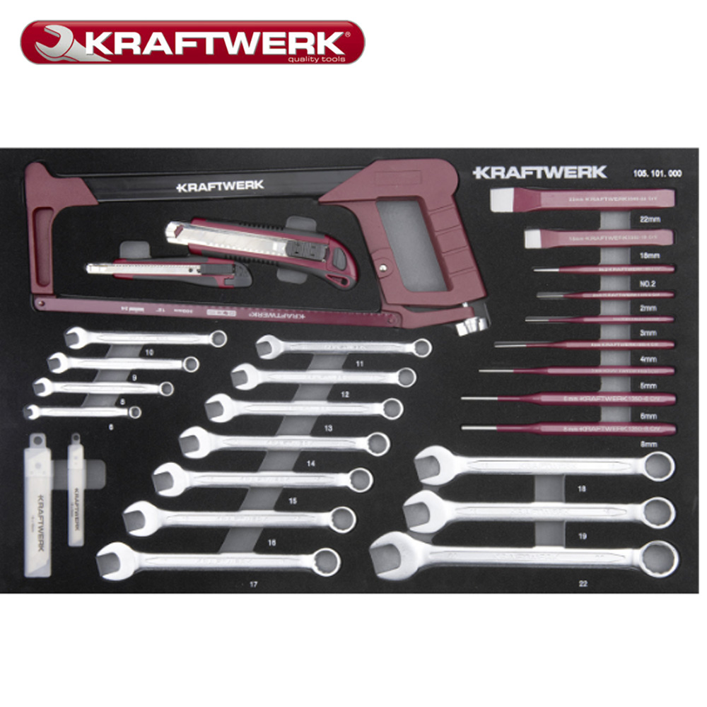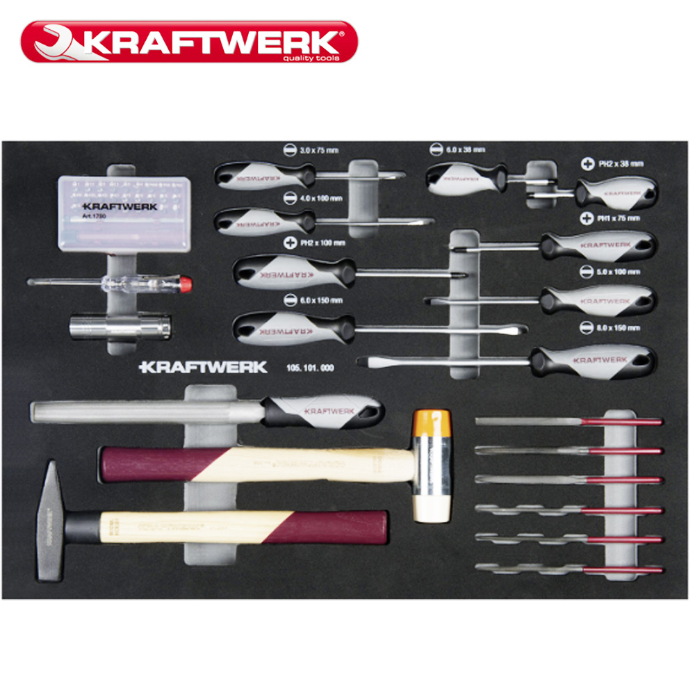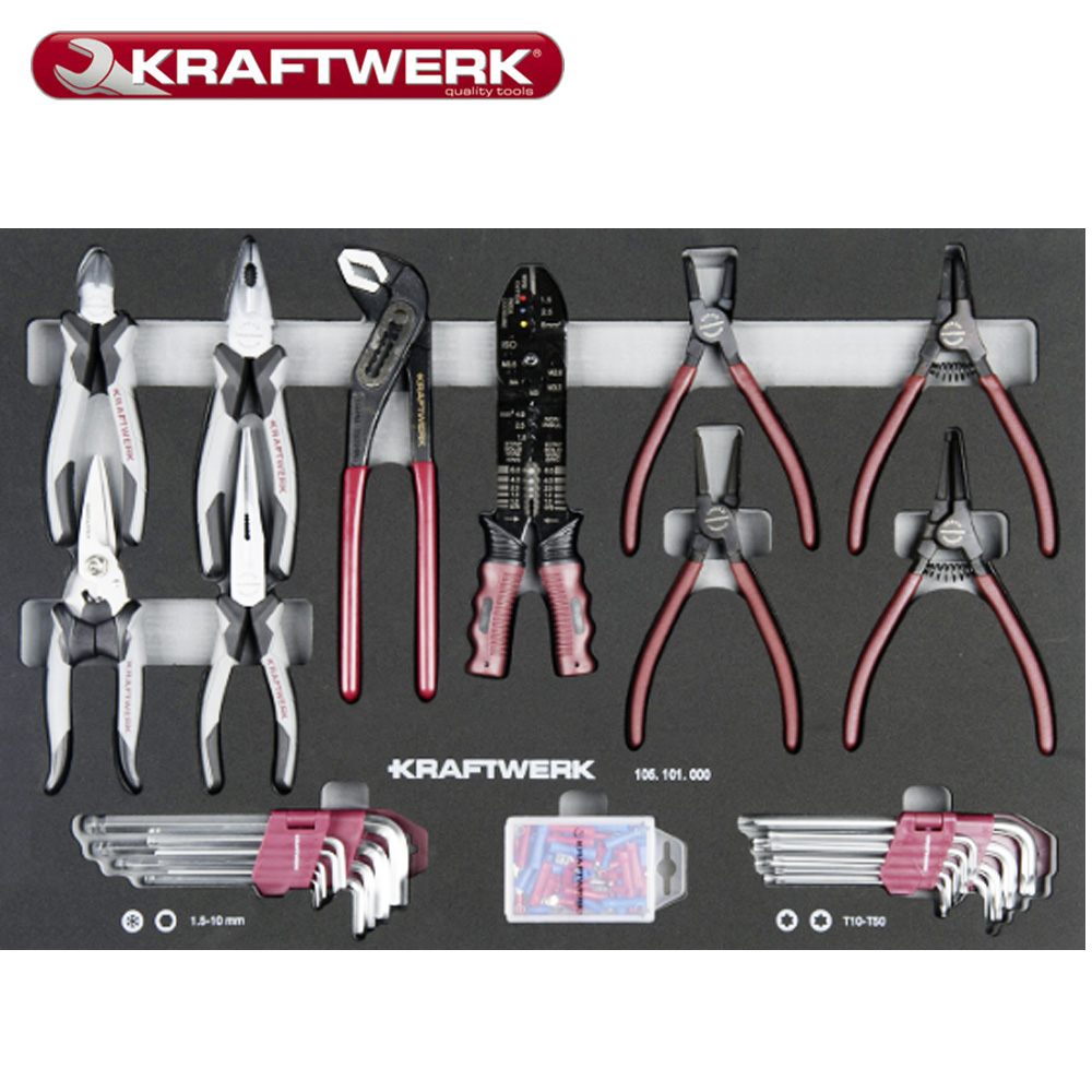 Kraftwerk 101.117.101 NY Basic Line værktøjsvogn med ABS-arbejdsoverflade og perforerede vægge på siden, fyldt med 339 værktøjer i 4 blødt skumindsatser med høj densitet 60/40 (EVA).