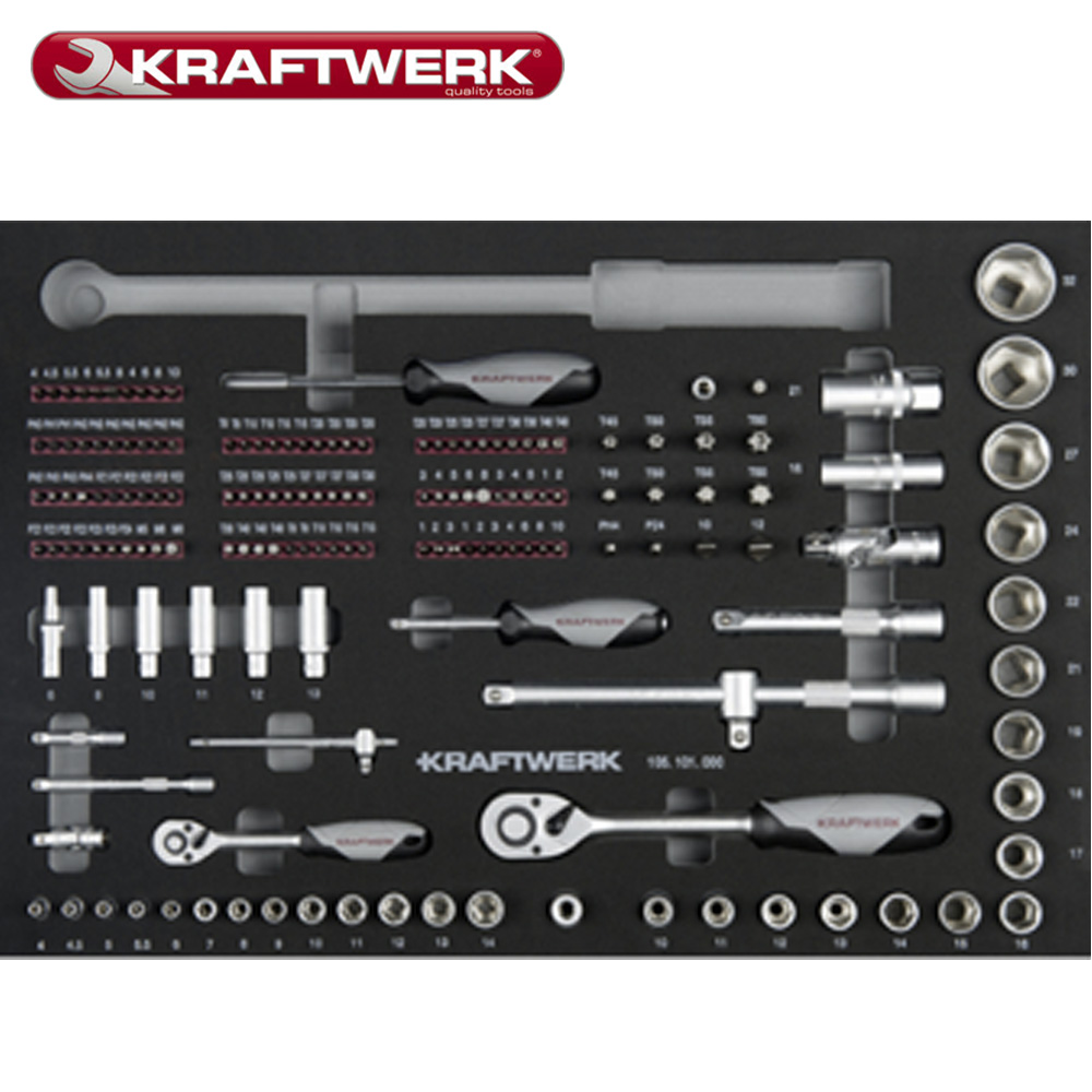 Kraftwerk værkstedsvogn B117 har 339 professionelle værktøjer, er udstyret med store skuffer og en høj belastningskapacitet. Men med et holdbart ABS-plastikafdækning med underinddeling. Og også med perforerede vægge med firkantede perforeringer. Yderligere værktøjer, emner osv. Kan knyttes til det. Vognen består af en stålkonstruktion (0,9 mm) med en højkvalitetspulverbelægning. Kroppen er grå med sølvfarvede skuffer. Disse kan trækkes ud over deres fulde længde og har en belastningskapacitet på maks. 45 kg. Kugleleje-skuffen kan åbnes over hele dens længde på enhver position på håndtaget. Vognen flyttes med sidehåndtaget (kan monteres på begge sider). Og de formonterede hjul (Ø 125 mm) sikrer god bevægelighed eller et fast stativ. Værkstedsvognen er låst centralt takket være cylinderlåsen på siden.