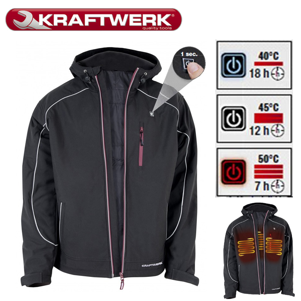 Tre opvarmningszoner med tre justeringsniveauer for en behagelig temperatur. Til arbejde og fritid: varm, behagelig og vandafvisende. Lang levetid takket være vindtæt, vandafvisende og rivebestandigt materiale. Med lynlås, side lommer og hætte. Reflekterende bånd for god synlighed i mørke.