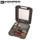 Det Kemper stabile loddesæt er værdsat af fagfolk og gør-det-selv-brugere, der forventer høj kvalitet, lang levetid og perfekt ergonomi. Den nyeste generation af Kemper-gassoldejern med justerbar spidsposition er udstyret med: Transparent gastank, sikkerheds piezo-tænding, effektregulering (4 positioner), flammestop og stativ. Den medfølgende kasse indeholder også en tinspiral, rengøringssvamp, deflektor og 5 tip til lodning, markering, modellering og skæring.