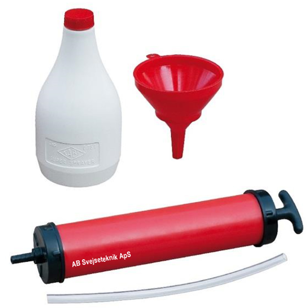 Sættet inkluderer ø90mm tragt, 0,7 ltr. Polyethylen beholder med kapsel samt kraftig 0,5 ltr. suge pumpe med transparent sugeslange. Sættet udmærker sig ved at sugepumpens volumen gør det muligt at opsuge alt brugt olie på en gang, i modsætning til andre mærker på markedet, hvor det tager 3-5 gange så lang tid.
