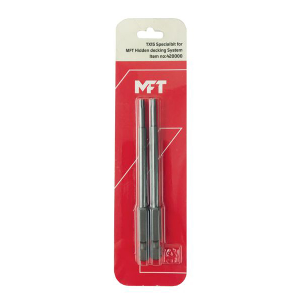 MFT TX15 specialbits til skjult montage af terrasseskruer. Bitsen har en speciel form, som passer sammen med MFT montageværktøj, for at få en korrekt monteringsdybde på skruen. Bitsen er produceret af hærdet S2 stål.
