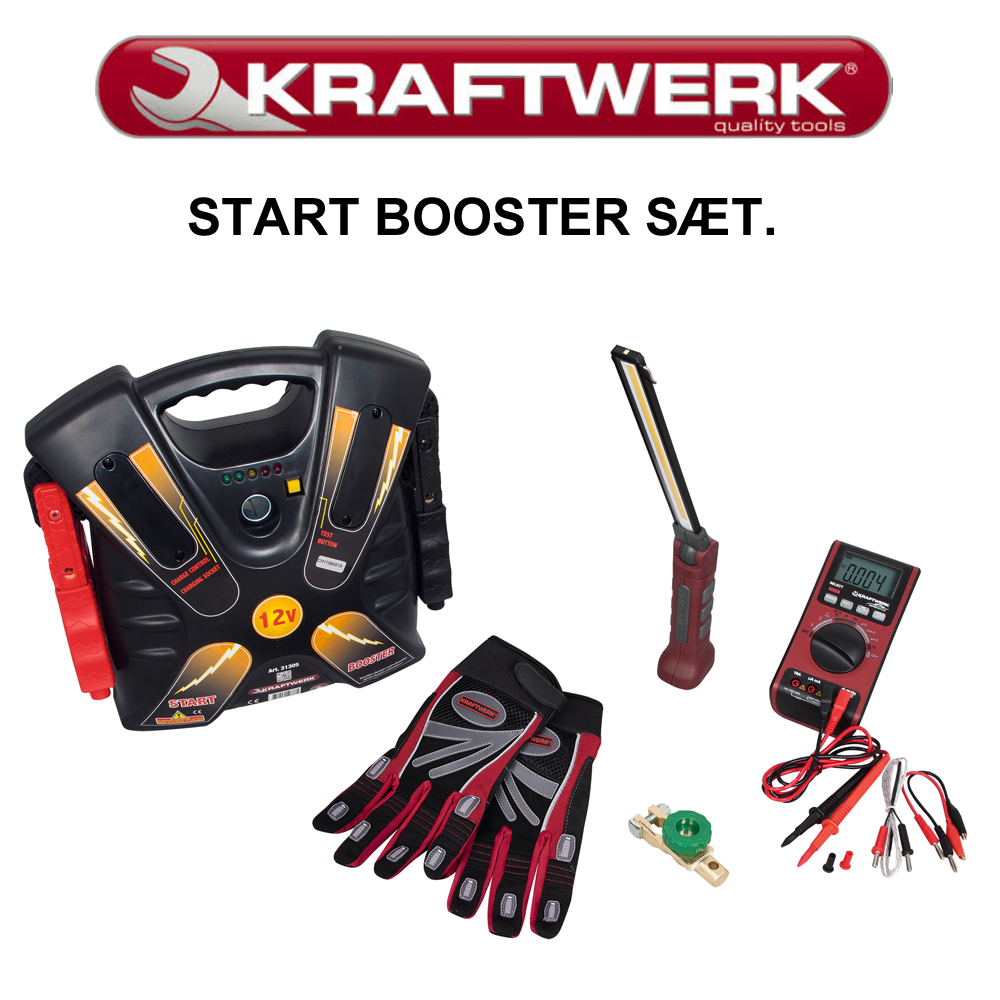 Start Booster Sæt indeholder.: Art. 31305 Professional start booster Se Data. Klik Her. Art. 32072 COB LED rechargeable cordless lamp 4 W Se Data. Klik Her Art. 31130 Digital multimeter Se Data. Klik Her. Art. 31309 Battery disconnect switch Se Data. Klik Her. Art. 7901 M Mechanic’s working gloves Se Data. Klik Her.