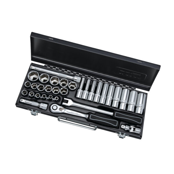 Oplev et solidt Topnøglesæt 3 8 32 dele værktøjssæt perfekt til værkstedet mekanikeren og gør det selv projekter. Sættet leveres i en praktisk værktøjskasse hvor alle 6 kant toppe fra 6 mm til 19 mm er organiseret sikkert og overskueligt. Inkluderet er en reversibel skraldenøgle med 60 tænder hvilket giver effektivt arbejde selv i trange rum. Dette sæt er ideelt til både tunge og almindelige opgaver på biler maskiner og udstyr hvor pålideligt værktøj er vigtigt.