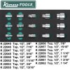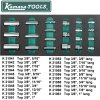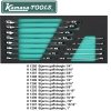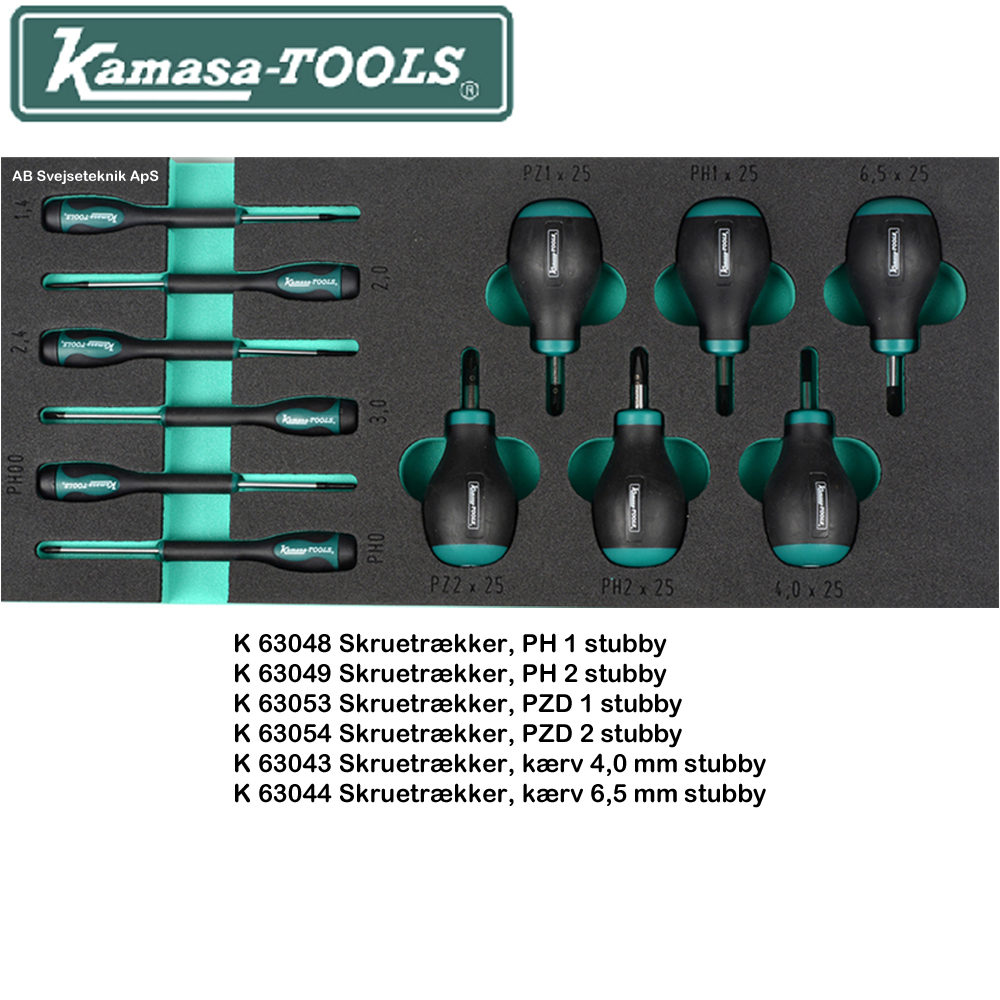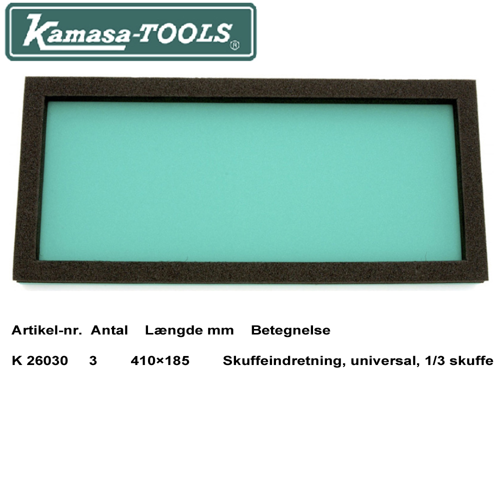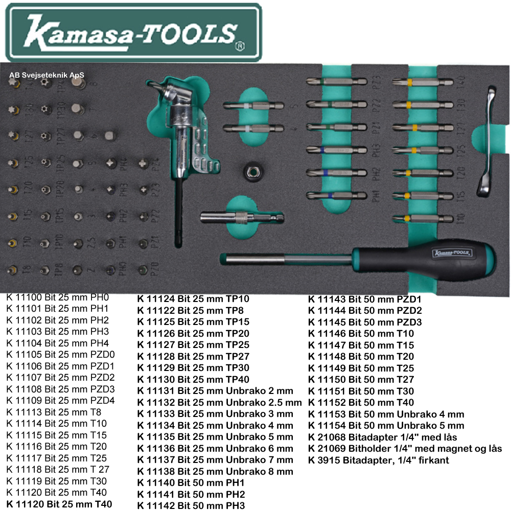 Vare nr. Antal Indhold K 26041 1 Skruetrækkere, T8-T30 K 26043 1 Tænger: Låseringstænger, udvendige og indvendige K 26045 1 Skruetrækkere: Kærv, PH med gennemgående klinge K 26046 1 Skærende værktøj: file, bor, saks, kniv K 26047 1 Slagværktøj: hammer, dorn, kørner K 26050 1 Ringgaffelnøgler, 6-23 mm K 26051 1 Ringgaffelnøgler, 24-32 mm K 26052 1 Lednøgler, 8-19 mm K 26053 1 Topnøgler 1/4": kort og lang top K 26054 1 Topnøgler 1/2": skraldenøgle, kardanled, forlænger, tændrørstoppe K 26056 1 Toppe, lange1/2", 10-24 mm K 26057 1 Topnøgler 3/8": skraldenøgle, kardanled, forlænger, tændrørstoppe K 26058 1 Toppe, korte og lange 3/8", 8-22 mm K 26060 1 Ringgaffelnøgler, tommer K 26061 1 Toppe, korte og lange 1/2": Unbrako K 26062 1 Unbrako og torx*: 1/4" Bittoppe & amp; nøgler K 26063 1 Toppe, korte og lange 1/2": XZN/torx* T og E K 26064 1 Toppe, korte og lange 3/8": Unbrako K 26065 1 Toppe, korte og lange 3/8": Torx* T og E K 26070 1 Toppe, korte og lange 3/8 ", 5/16"-1 " K 26074 1 Toppe 1/2", 10-34 mm K 26151 1 Specialskruetrækkere K 26152 1 Kærvskruetrækkere K 26153 1 Skruetrækkere: PH, PZD K 26182 1 Bits og bitværktøj K 26059 1 Toppe 1/2", 3/8"-1 1/4 " K 26030 3 Skuffeindlæg 410 x 185