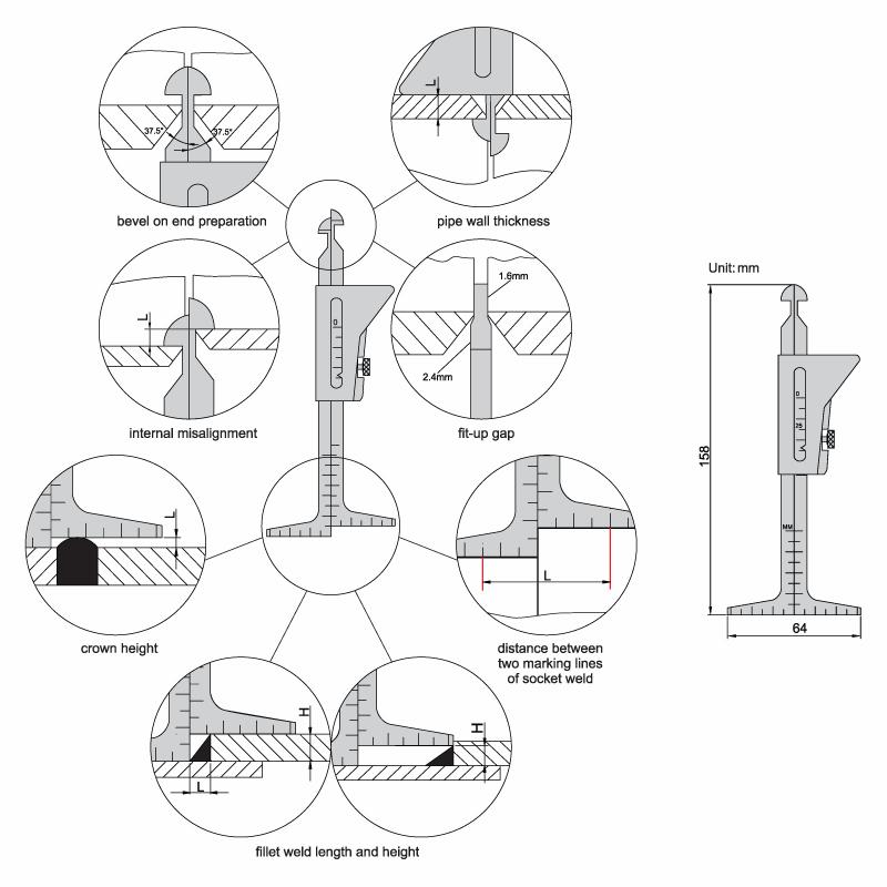 Rustfri kantforskydningslære 0-35 mm, luftspalte 1,6 og 2,4 mm, godstykkelses måling 0-45 mm. Med stor fod, til kontrol af kantforskydning, mm og inch. skala.
