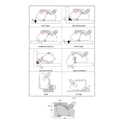 Med mm og inch skala. Rustfri universal svejselære, til kontrol af svejsninger med let aflæsning. Denne kan også benyttes til kontrol af svejsninger med ”kærv fejl” bort brænding eller mekanisk fjernet, svækket materiale. Skærpningsvinkel: 0-60º. A-mål: 0-25 mm. Nøjagtighed: ±0,50 mm.
