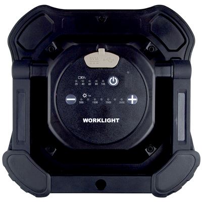 Kompakt, portablel og meget kraftfuld arbejdslampe med 30W COB LED (3500 lumens) med trinbar justering af lysstyrken. Indbygget, genopladeligt Li-Ion batteri og kraftig, vipbar stander med hul til opspænding.