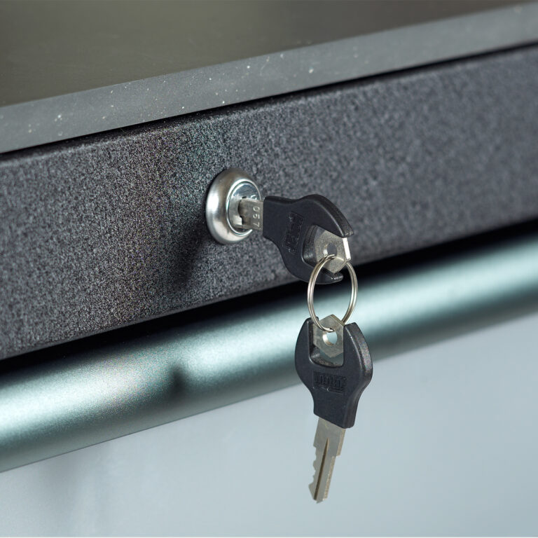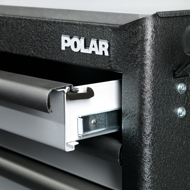 Polar Tools har udstyret vognen med et centrallåsesystem, så alle skuffer kan låses samtidig – ideelt til opbevaring af værdifuldt værktøj. Den robuste konstruktion kan tåle op til 750 kg statisk belastning, og hver skuffe kan bære op til 40 kg.