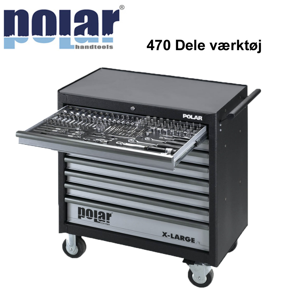 Polar Tools X-Large værktøjsvogn med 8 skuffer og 470 værktøjer er udviklet til dig, der ønsker en pålidelig og overskuelig værkstedsløsning med masser af opbevaringsplads og et omfattende værktøjssæt. Denne værktøjsvogn kombinerer funktionel opbevaring med et stort udvalg af værktøj, der dækker de mest almindelige opgaver inden for reparation, montage og vedligeholdelse.